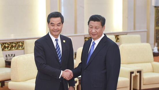 習近平聽取了梁振英對香港當前形勢和特區政府工作情況的匯報。習近平指出,中國共產黨十八屆四中全會提出了全面推進依法治國總目標,強調依法保障“一國兩制”實踐,保持香港、澳門長期繁榮穩定,依法保護港澳同胞利益。這是我國推進國家治理體系和治理能力現代化邁出的重要一步,對全面準確貫徹“一國兩制”方針和基本法、促進香港長治久安具有重要意義。法治是香港長期繁榮穩定的重要基石。中央政府充分肯定、全力支持行政長官和特區政府依法施政,特別是為維護法治權威、維護社會秩序所做的大量工作。