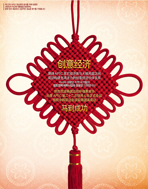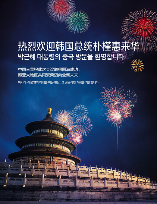 2014年11月10日,四家在華韓國企業在人民日報刊登四個整版廣告,歡迎樸槿惠總統來華參加APEC領導人非正式會議。