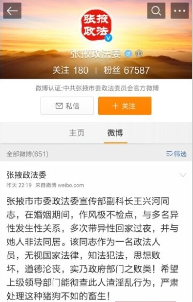 “自我舉報”的原文微博稱,“張掖市市委政法委宣傳部副科長王某某同志,在婚姻期間,作風極不檢點,與多名發生異性發生性關系,多次帶異性回家過夜……希望上級領導部門能徹查此人渣淫亂行為,嚴肅處理這種豬狗不如的畜生。”