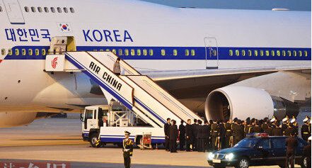 11月9日下午,韓國總統朴槿惠乘紅白藍三個元素組成的韓國專機落地北京機場。