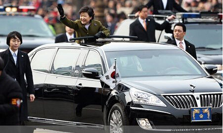 朴槿惠乘坐的專車是加長版雅科仕防彈車,這輛車是為就職典禮特製的,只有一輛。基本車身是韓國現代雅科仕,防彈技術大都來自德國。