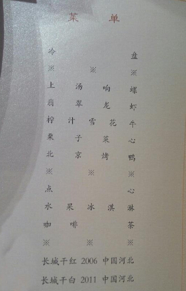 11月10日晚,習近平主席和夫人彭麗媛為21經濟體的領導人和代表在水立方舉行盛大的歡迎晚宴。据《新京报》报道,APEC會議歡迎晚宴會是國宴規格,先是一道冷盤,隨后按照順序依次是上湯響螺、翡翠龍蝦、檸汁雪花牛、栗子菜心、北京烤鴨,為“四菜一湯”,之后是點心、水果、冰淇淋、咖啡、茶。而為21個經濟體貴賓們提供的酒水則是長城干紅2006和長城干白2011,均為中國產地河北。此前網上曾熱議的茅臺,最終還是未能出現在APEC國宴上。