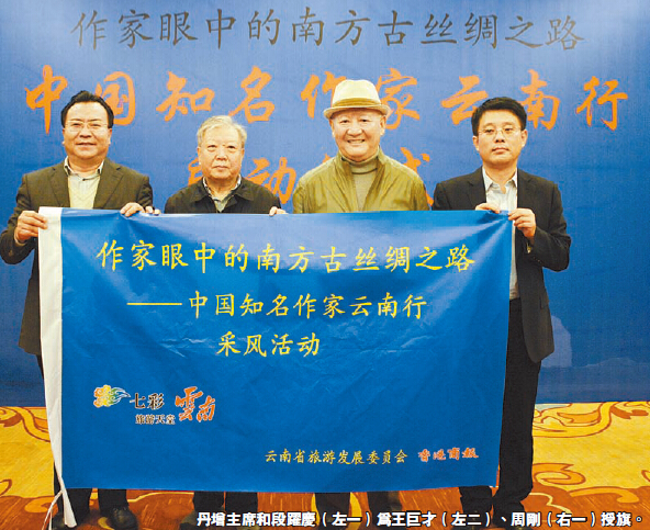 昨日上午,「作家眼中的南方古絲綢之路——知名作家雲南行」采風活動啟動儀式在昆明翠湖賓館舉行。中國作協副主席丹增、雲南省旅游發展委員會主任段躍慶向知名作家雲南行采風團團長王巨才、香港商報總經理周剛授予活動旗幟。中國作協原黨組副書記、中國散文學會會長王巨才,人民文學原常務副主編、中國散文學會副會長肖復興,《海燕》主編、詩人、作家李皓,人民武警出版社副社長、魯迅文學獎獲得者、大校溫亞軍,《詩刊》主編、著名詩人葉延濱,第六屆魯迅文學獎獲得者任林舉,黑龍江作家協會文學院院長、第六屆魯迅文學獎獲得者李琦,天津作協文學院院長、第三屆魯迅文學獎獲得者肖克凡,天津作協專業作家龍一等出席啟動儀式。