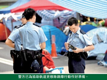 律政司、警方、執達主任及入稟申請人代表,昨日開會商討如何協助執達吏執行高等法院延長禁制令的安排,警方最快會在星期四、五采取行動,至於先清除旺角抑或金鐘的障礙物,就會視乎入稟人的意願,警方會給予配合,但現階段不會有清場行動。警方已通知負責處理占領事件約7000名警員候命,并取消本周末的休假。