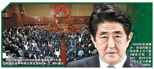 安倍此次外訪結束后的17日,日本政府屆時將發表今年7月至9月的GDP數值,該結果預料并不會理想。首相官邸計劃在18日召開專家委員會會議,對經濟景氣和增稅問題進行研究,而增稅計劃也很可能遭到否定,成為解散國會的關鍵。瑞穗證券公司首席市場策略師上野康成通過電郵發送的報告指出,如果今年提前舉行大選,在反對黨還來不及準備的情況下,自民黨這次就可以像上次一樣大獲全勝。