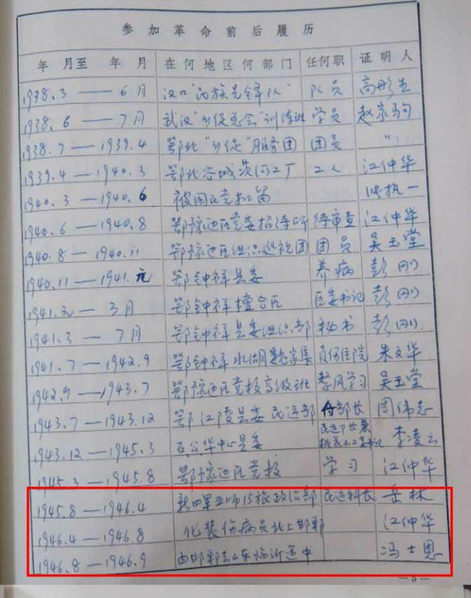 檔案中“參加革命後的經歷”顯示如下:(按時間、單位和職務橫向排列)