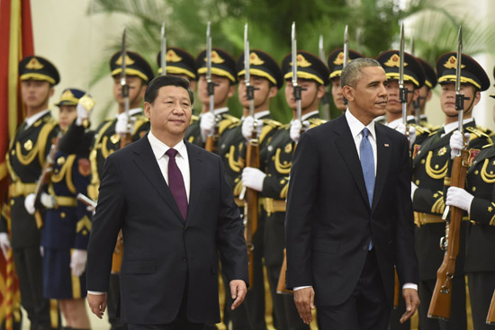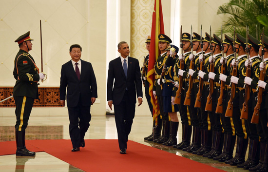國家主席習近平12日在人民大會堂舉行歡迎儀式,歡迎美國總統奧巴馬對中國進行國事訪問。