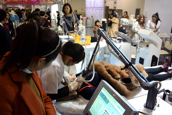 11月11日,在濟南舉辦的2014中國(濟南)國際美容化妝品產業博覽會上,植眉、紋唇、美發等臨床美容大受熱捧,吸引了大量參觀者前來體驗。美博會為期三天,集中展示日用化妝品、美體、美發產品、整形美容儀器設備等美容產業系列產品和技術。