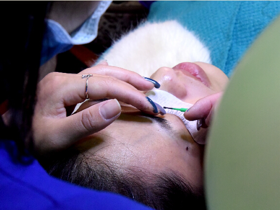 一位美容師在濟南秋季美博會現場為一名女士修飾睫毛