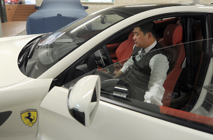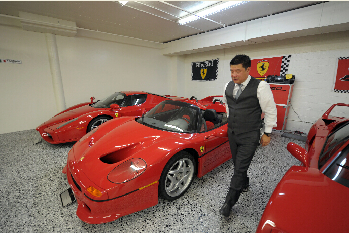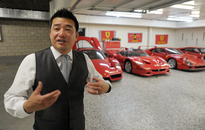 美國洛杉磯的圣蓋博谷,人們經常能?見到街頭有法拉利、林博基尼、賓利等豪車駛過。當地華人喜愛駕駛豪車,而且開豪車的人越來越多。著名商人李兆佳不僅在珠寶與鐘表經營方面卓有建樹,他也是一個執著的法拉利豪車收藏家。圖為李兆佳在車庫介紹他的收藏品。
