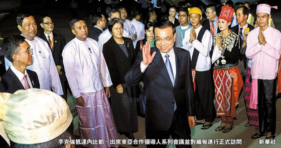 在會見美國總統奧巴馬後,國務院總理李克強昨午旋即前往首都機場啟程奔赴緬甸,並於昨晚抵達內比都,開啟又一次中國外交行程。在緬停留的一天半時間裏,李克強將出席三場會議,並對緬甸進行正式訪問。此行雖然從機制上看是每年一度的例行會議,卻肩負著新的歷史任務。作為中國近期外交高潮的重要組成部分,乘著北京APEC會議的東風,此訪將對進一步深化中國—東盟、中緬關係,推進東亞區域合作,維護地區和平穩定具有重要意義。 余永勝