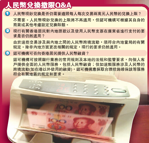 個人兌換人民幣撤限,有人歡喜,有人愁。市民均歡迎有關措施,更坦言未來會考慮兌換更多人民幣;銀行界也指取消人民幣兌換限制,令產品設計更靈活;不過,打小本生意的找換店憂放寬兌換限制加劇競爭。