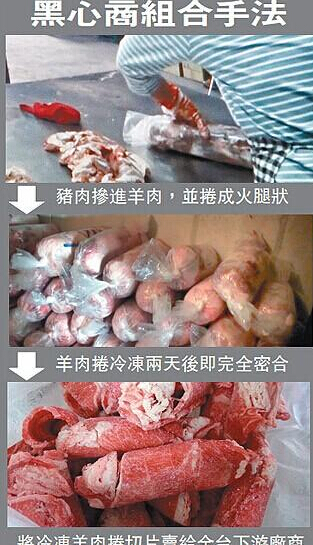 繼多家企業被曝生產“黑心油”后,臺灣地區近日再次曝出食品安全問題。據媒體報道,高雄市、新北市多家公司涉嫌以豬肉摻羊肉、羊肉灌水、羊油拌豬肉等方法生產假羊肉。而問題羊肉流向臺灣地區117家火鍋店、夜市及小吃店。