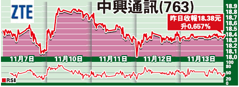 中興通訊(763)日線圖呈陽燭走勢,將回試早前高位,第四季應較樂觀,支持位在18元;集團預期全年盈利介乎25億至28億元人民幣,按年升84%至1.06倍,今年盈利能力持續改善,受益市場4G建設持續展開,而全球智能手機品牌當中,中興的品牌忠誠度較低,只有11%,但在低端智能手機市場仍具競爭力,機構投資者對今明兩年的手機出貨量及營收預測較保守,預測市盈率17.8倍,估值仍合理。
