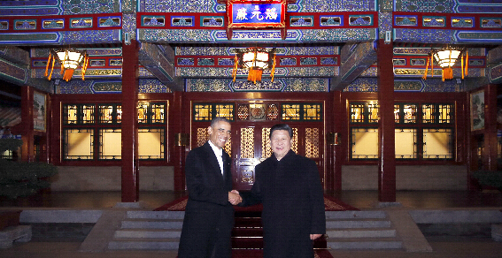 11月11日晚,習近平同美國總統奧巴馬在瀛臺涵元殿前握手。 新華社