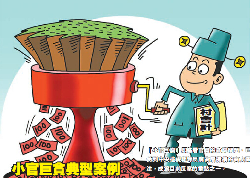 資料顯示:自2001年以來的10年間,在媒體視野出現、涉案金額上千萬元的貪污腐敗案例中,科級和科級以下官員至少有17個。這17個腐敗官員中,有13個作案在2008年以后,其中6個涉案金額近億元或上億元。由此可見,小官巨貪正呈現上升勢頭。