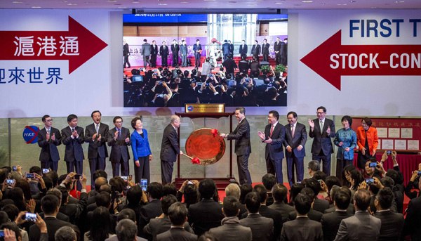 11月17日,香港特區行政長官梁振英(中右)和香港交易所主席周松崗(中左)在香港交易所一起敲鑼,宣布滬港通正式開通。