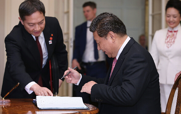 习近平在堪培拉政府大厦留名簿上签名。路透社
