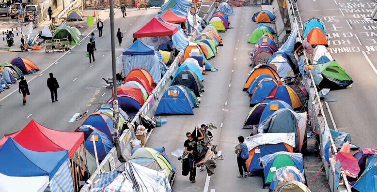 香港高等法院上個月頒布了臨時禁令,禁止示威者占領旺角和金鐘的多條路段。在這之前,香港三個的士和小巴業團體要求高等法院禁止繼續占領亞皆老街、登打士街、通菜街和砵蘭街的交界處。這里是旺角商業最集中的地區,也是的士和小巴做生意的重要地方。高等法院法官潘兆初認為,堵塞道路對公眾造成滋擾。該臨時禁令還禁止抗議者阻礙金鐘附近的龍匯道及添美道3個出入口。