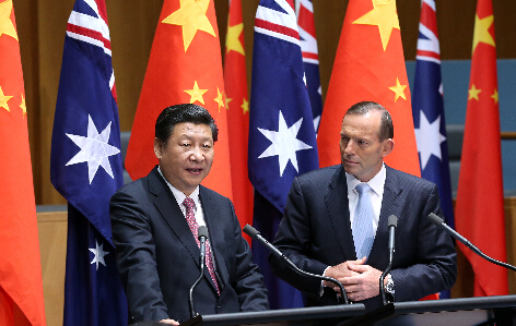 11月17日,國家主席習近平在堪培拉與澳大利亞總理阿博特共同會見記者。新華社記者 龐興雷 攝