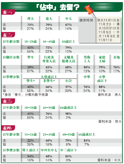 不過,如果加上中大的民調,則進一步將青年分拆為15至24歲和25至39歲兩組,前者的去留占比分別是22%和38%,與前面兩項調查的結果相若,惟后者卻分別是60%和18%,支持退場的處於明顯凌駕地位,也就是說,那條年齡分隔線實應前移至24歲(見表四)。