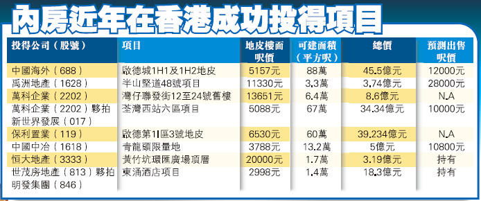 2014年,逾10家內房在香港總共參加了超過20塊土地投標,無論在數額還是投標規模上都有明顯增長。資深投資銀行家溫天納指本地開發商比較保守,內地開發商相對進取。「我們看到內地開發商慢慢變成香港的一個新力量,從以前的國企中國海外(668)和華潤,到現在的民企萬科和世茂,越來越多的內房參與到香港市場,並且姿態十分進取。」