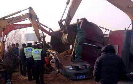 據在現場采訪的山東廣播電視臺齊魯頻道記者張越介紹,事故中造成12人死亡的為一輛金杯面包車。在與一輛拉沙的大貨車對向行駛過程中,大貨車側翻,將面包車掩埋。