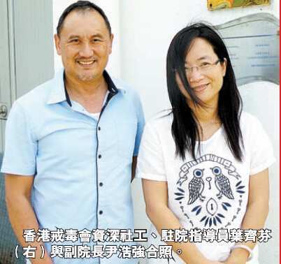 康復院工作成效除有賴於院方職員和義工外,亦得社會團體和人士支持,在「敬社」內遇到香港戒毒會社工、駐院指導員葉齊芬,香港大學畢業的她,隸屬北九龍社會服務中心,從事社工工作十多年,2006年至2012年曾負責輔導感染愛滋病者的工作,1年前主動要求轉任駐院指導員。她表示,指導男性戒毒者不會令她有顧慮,平時,他們光着膀子玩耍,約見時,經過提示,他們會尊重女士,不講粗口。她說,與男性戒毒者說話時,女社工較男性社工細微、體貼,更容易被接受,她又笑言,一些青少年戒毒者與她通信時,以「媽咪」稱呼她,她亦用湊仔式的語氣與他們通信,大家交談得很融洽,有利於戒毒指導工作。