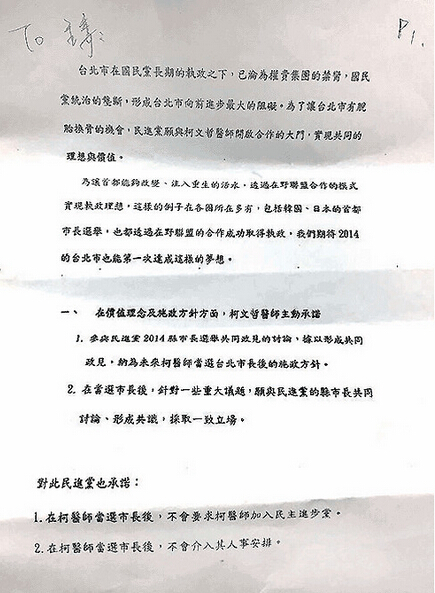 柯文哲說,當時不是寫一、二、三,然后簽約蓋章。主要是民進黨臺北市黨部主委黃承國跟他談的,對方最關心的是市議員輔選,里長部分則視情況而定。