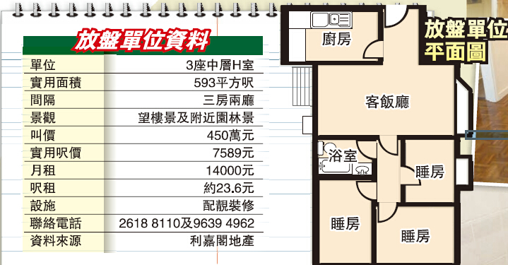 今期介紹的屋苑為約20年樓齡的「恒豐園」,單位屬於第3座中層H室,實用面積593平方呎,三房兩廳間隔,主要望樓景及附近園林景。業主叫價450萬元,折合實用面積呎價7589元,屬於市價水平。綜合利嘉閣地產數據,「恒豐園」近期實用面積呎價叫價介乎5902至8432元之間,平均實用面積呎價叫價7182元。