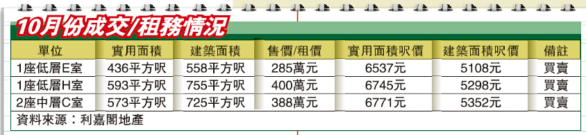 利嘉閣地產分區經理梁桂華表示,由於市場上盤源缺乏,業主長遠看好物業回報,持貨能力強,市場上一度呈現買賣兩閒現象。綜合土地註冊處及利嘉閣地產數據,11月截至11日,「恒豐園」並未錄交投,10月份就錄3宗成交,成交價介乎285萬至400萬元,實用面積成交呎價頗為平均,由6537至6771元。其中新近一宗成交為第2座中層C室,單位實用面積573平方呎,以388萬元獲得承接,折合實用面積呎價6771元。