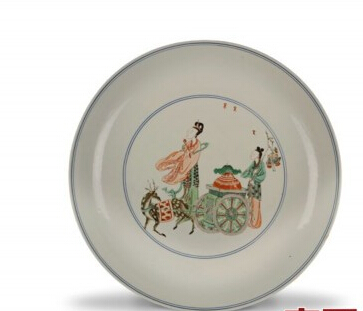 由北京首博文化發展有限公司提供的康熙五彩麻姑獻壽紋盤在內底繪一頭鹿拉車,俗稱“鹿拉車”,車上一隻大酒罈封著蓋,車的左側仙女麻姑肩荷如意,一童子隨行其後,空中翻飛著幾隻紅色蝙蝠。圖繪精妙,色彩絢麗。外壁用青花書篆體“壽”字一百整。麻姑為傳說中的女仙,見於葛洪《神仙轉》,舊時以麻姑喻長壽。又傳,三月三日西王母壽辰,她在珠河畔以靈芝釀酒祝壽。此類獻壽圖器為康熙六十壽辰所制,傳世品罕見。