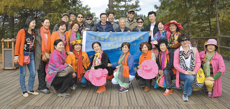 一座相對高度不過50多米的小空山,火山口直徑卻能達到150米,且深達70米。拾級而上,山路兩邊的植物翠綠繁茂,已經完全看不出若干年前它噴發怒吼的模樣。走到山頂,眼前渾圓的錐體空空洞洞,看似無物,實則盛滿了大自然的無窮奧秘。在火山群附近,游客還可以撿到灰、紅、黑等顏色的火山石作紀念。這種火山石的比重很輕,從外表看倒更似泡沫,人稱「浮石」。一個人可以輕輕地舉起很大的一塊,投入水中卻不會下沉。人們所說「石沉大海」的自然規律,在這里并不靈驗。當看到采風團拿著「知名作家雲南行」的旗幟照相時,旁邊一群身著鮮豔衣服的大媽突然圍了上來,爭相與采風團合影。一位大媽告訴記者,她們是從陝西漢中來的旅行團,從成都玩到了雲南,沒想到居然能在騰沖遇到這麼多知名作家。