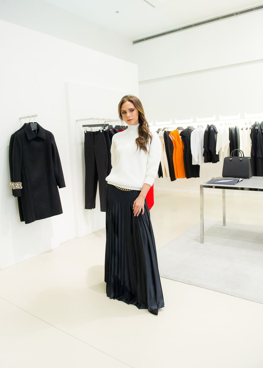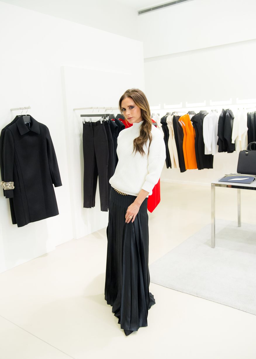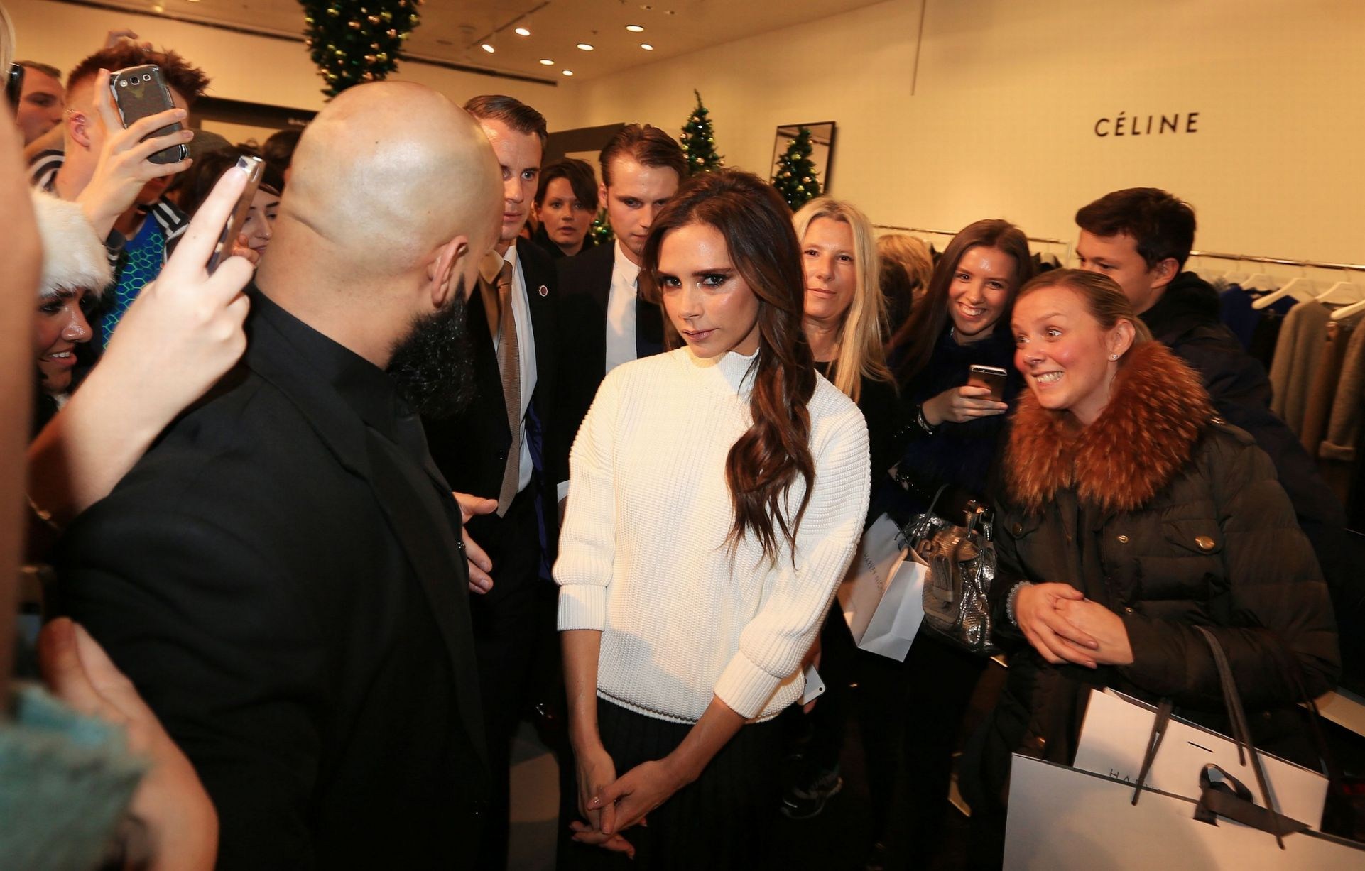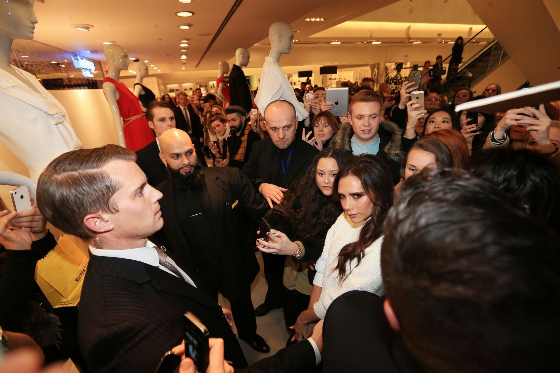 2014年11月19日,英國曼徹斯特,維多利亞亮相當地的塞爾福裡奇百貨公司,展示自己最新的服裝設計成果。儘管現場人頭攢動,一襲白衣的貝嫂始終保持著經典的“石化”表情。