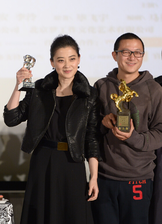 《推拿》慶功 梅婷與老公曾劍同臺舉獎杯。 11月24日晚,電影《推拿》在北京舉行慶功兼首映式,導演婁燁攜郭曉冬、秦昊、梅婷、張磊、曾劍、富康等主創出席,并分享獲獎心得。《推拿》講述了一群盲人按摩師的故事,該片在第51屆金馬獎上獲得6項大獎,除最佳劇情片之外,還由張磊獲得最佳新演員,馬英力獲得最佳改編劇本,曾劍獲得最佳攝影,孔勁蕾、朱琳獲得最佳剪輯,富康獲得最佳音效。圖為梅婷與老公曾劍同臺舉獎杯。