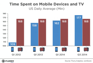 Flurry指出,“去年我們就發現了移動設備使用時間難以置信地增長的跡象。消費者依靠移動應用健身,與同事合作、提高工作效率,提高自己喜歡的運動項目的水準。隨著越來越多消費者在生活的方方面面中使用智慧手機,他們看手機螢幕的時間長於電視機是合乎邏輯的。”