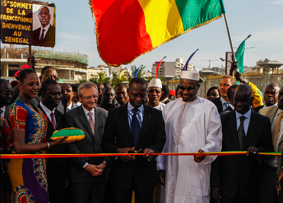 在塞內加爾首都達喀爾,塞內加爾總理穆罕默德·迪奧納(中)為法語國家文化村剪彩。