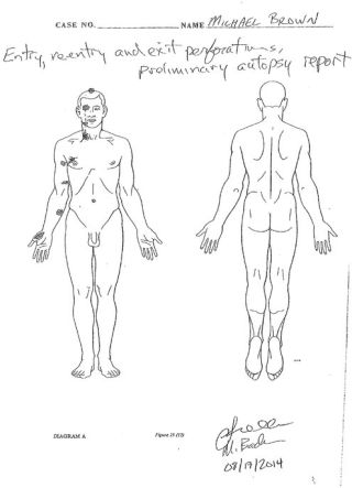 獨立的調查人員給出了對布朗屍檢的圖片報告。這是一幅黑白的素描驗屍圖解,上面畫著死者裸身的前後像,並用小黑點標注了子彈的襲擊部位。一名驗屍員稱,根據檢測發現,死者身中六枚子彈。