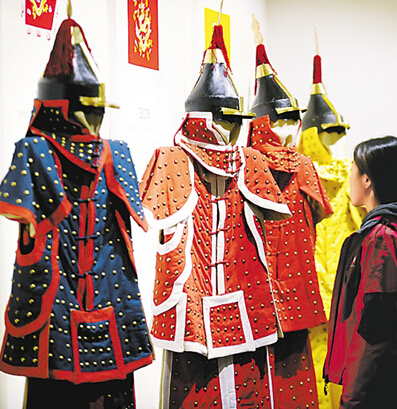 參觀者在欣賞清代作戰服飾。