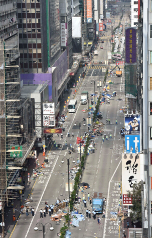 今日下午,旺角彌敦道占領區,清除障礙物行動進展順利,警方用了兩個多小時完成,約下午三時半,彌敦道南北行線全部六線都恢復通車。巴士公司亦派人清理巴士站牌。警方下午約兩時四十五分,將原先停留在登打士街及砵蘭街交界路面的十多名占領人士,趕回行人路,未遇到反抗。現時車輛可以經登打士街左轉出彌敦道,通車一刻有途人拍掌歡呼。在場仍有一批警員戒備。