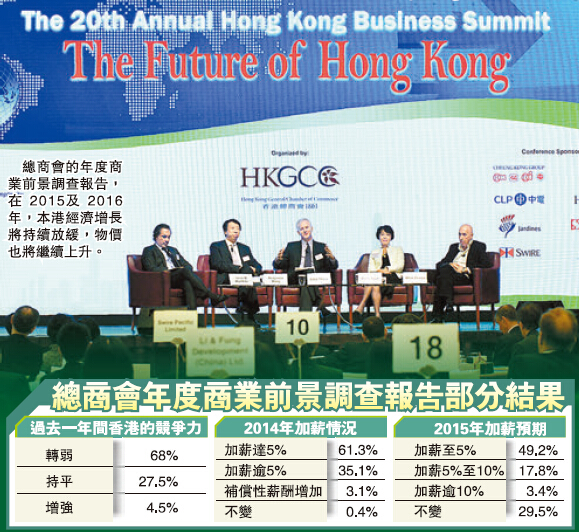 【香港商報訊】記者黃稀爾報道:香港總商會昨發布年度商業前景調查報告,預測本港明年實質經濟將溫和增長約2%至3%,通脹約為4%,在2015及2016年,本港經濟增長將持續放緩,物價也將繼續上升,並認為違法佔中行動對各行業的影響不會延續至明年。多位商界人士均表示,希望佔中風波可盡快平息,並建議本港可在房屋供應、金融業務、營商模式等方面作出改變,以促進經濟可持續發展。