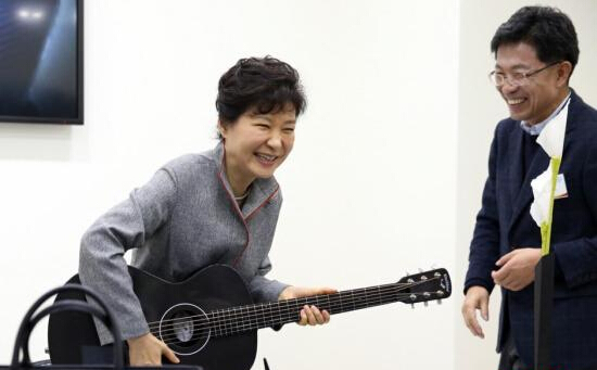 資料圖:韓國全羅北道全州市,韓總統樸槿惠出席“創造經濟革新中心”揭牌儀式,并視察該中心,樸槿惠在視察中試彈用碳纖維材料制作的吉他多才多藝。