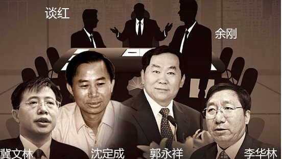 正因為他的影響,自去2013年8月以來,周永康的“石油幫”轟然坍塌,已被查處的高官包括升任國資委主任,此前任中國石油集團董事長、黨組書記的蔣潔敏;中石油副總經理兼大慶油田有限責任公司總經理王永春;中石油副總經理李華林;中石油副總裁兼大慶油田分公司總經理冉新權;中石油總地質師王道富、總會計師溫青山等等(下圖從左至右)。