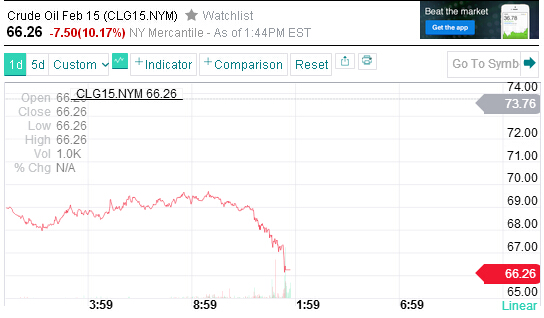 【香港商报网讯】北京時間11月29日凌晨消息,紐約原油期貨價格周五收盤暴跌10.23%,報每桶66.15美元,這一價格創下紐約原油期貨自2009年9月25日以來的最低收盤價。主要由于歐佩克(OPEC)決定把產量目標維持在3000萬桶/日不變,增強了市場有關原油市場供應過剩狀況很可能將持續下去的擔憂情緒。