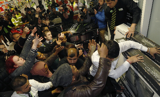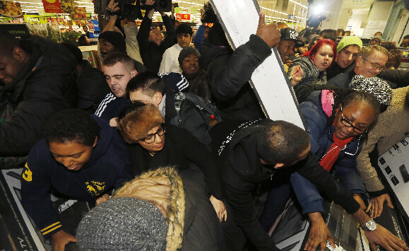 據英國《每日郵報》11月28日報道,英國倫敦,黑色星期五,消費者在阿斯達超商搶購打折電視機,手腳并用場面混亂。