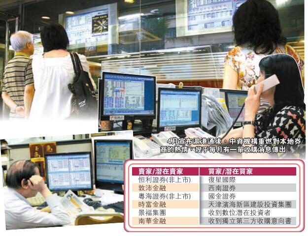 4月宣布滬港通后,中資機構重燃對本地券商的熱情,幾乎每月有一單收購消息傳出。9月時富金融(510)獲國企天津海濱新區建設投資洽購,以現金方式收購51%的股權,作價8700萬美元;7月復星國際(656)完成了對恒利證券的收購,惟沒有披露具體作價;6月敦沛(812)被西南證券相中;4月國金證券向粵海證券拋橄欖枝;傳出洽售股權的還有景福金融和南華金融(619)等。