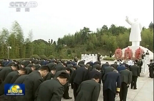 10月31日,习近平向毛泽东雕像敬献花篮,带领大家向毛泽东雕像三鞠躬。央视截屏图