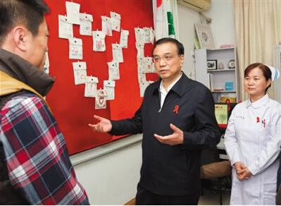 李克強首先來到感染科病房,看到這里一對艾滋病患者夫婦通過實施母嬰阻斷措施擁有了健康寶寶,李克強高興地為孩子送上祝福。他說,艾滋病可防可控可治,這個孩子給你們一家帶來了歡樂,也讓更多患者燃起生命的希望。我們已經決定,將一些技術上成熟、成本可控、社會效益好的防艾措施,在2015年底前推廣到全國,力爭率先在孩子身上實現“零艾滋”目標。