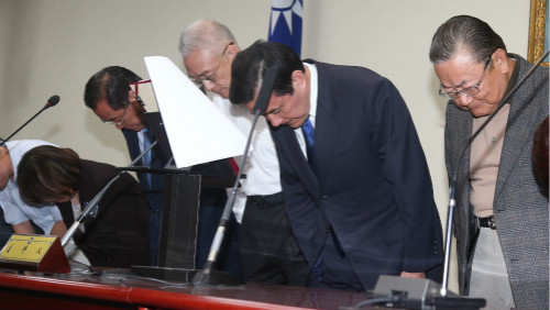 身兼国民党主席的总统马英九(右2)29日表示,九合一选举结束,国民党遭遇极大挫败,他在此表示歉意。中央社