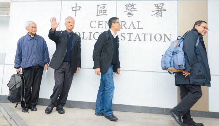 其餘自首人等,陳健民、朱耀明、陳日君、浸大社工系講師邵家臻、立法會議員胡志偉、屯門區議員陳樹英、民主黨共15名成員,包括楊森、蔡耀昌、張文光、陳樹英等,漫畫家尊子、一木亦在3時前後到場,準備自首。朱耀明繼前天在記者會上「忽然」流淚後,昨午自首前又再於半百傳媒的鏡頭前眼泛淚光,與唱著聖詩的市民一一擁抱,期間有其支持者亦舉起黃傘,高叫口號聲援,自首程序淪為「爛騷」。